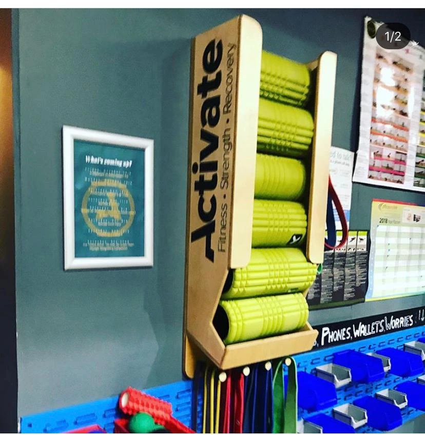 Our Wall Mount Foam Roller Dispenser is custom made and can hold up 6 Foam Rollers. The dispenser works by loading in from the top which allows any user to conveniently pick up their roller from the bottom. Especially during a time where cleaning and wiping down products is of utmost importance, this product really shows its value. It also allows you to keep more floor space. It prevents foam rollers being left scattered around the gym as well.